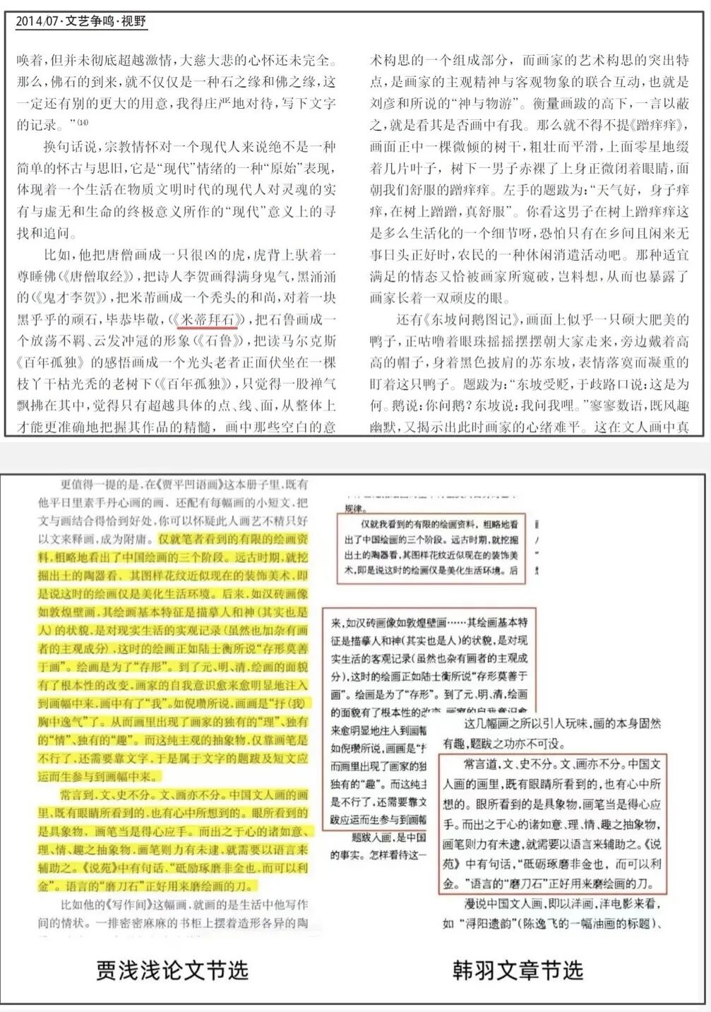 此外,贾浅浅文章开篇对中国绘画“三阶段论”的论述,其整体框架、逻辑推演及所引古人语句,与作家韩羽2008年12月发表于《美文》杂志的文章部分段落高度一致。在关于“文画关系”“题跋艺术”等部分的论述中,从独特的个人化比喻(如“语言的磨刀石”)到具体的论证过程,二者也呈现出雷同之处,亦未标注引用文献。