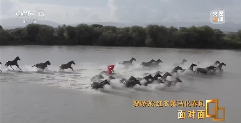 昭苏,位于伊犁河谷,是著名的中国天马之乡。天马浴河是当地为开发旅游打造的展示性节目。2021年7月,贺娇龙决定策马加入这一场景中的马群。
