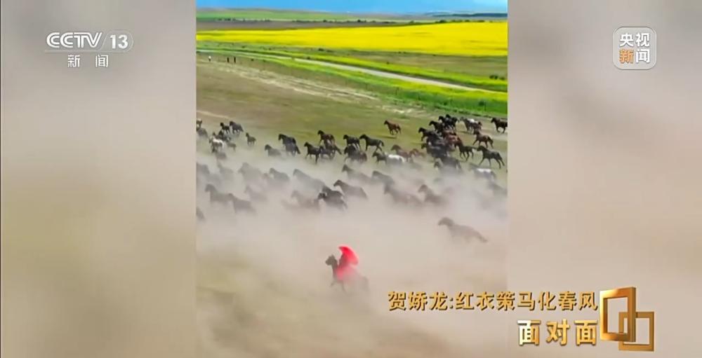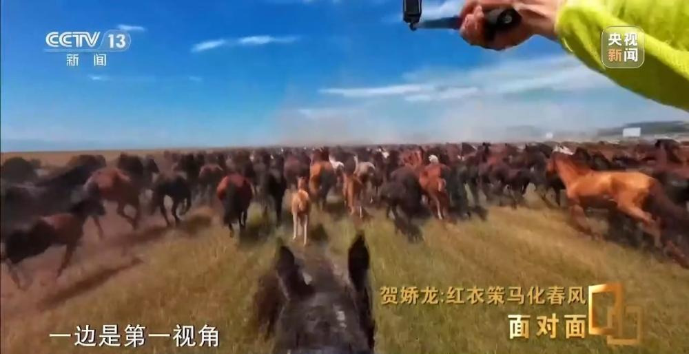 海沙尔:她上来之后就抖一下衣服,把脸上的泥巴简单擦一下,然后就说换一匹马再来一次,我们就当场换了一匹马再来,她在那来回跑了好几趟,把这条视频拍完。
