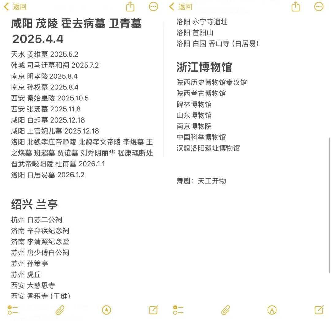 非鱼的父亲是历史老师,她从小浸泡在各种历史人物典故里,对这些古人有种天然的好奇。从去年清明到现在,非鱼的足迹遍布陕西、甘肃、河南、江苏。她在手机备忘录里仔细记录着每一个去过的地方:茂陵(汉武帝)、杜陵(汉宣帝)、阳陵(汉景帝)、张良墓、姜维墓、李煜墓、上官婉儿墓、司马迁祠、孙权墓……一年下来,非鱼跑遍了30多座历史人物的坟墓,“只要有时间我就去”。