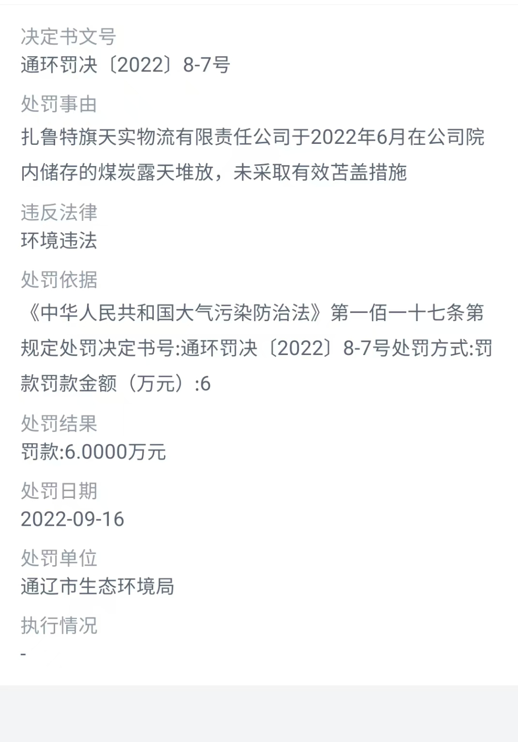 天眼查数据显示,天实物流厂区内存在露天堆放煤炭未采取有效苫盖措施的情况,通辽市生态环境局扎鲁特旗分局于2022年8月11日对其实施行政处罚,处罚金额为6万元。2025年12月,行政单位再次以相同事由对其实施行政处罚,处罚金额为4.8万元。