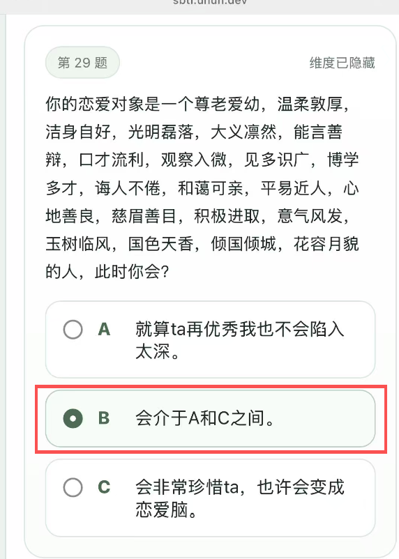 据了解,该测试以MBTI为灵感框架,用户通过完成答题之后测出“尤物”“吗喽”等抽象自嘲标签,因其内容具有荒诞性与戏谑色彩引发社交狂欢。该测试的界面也同样回应了MBTI,表示“MBTI已经过时,SBTI来了”