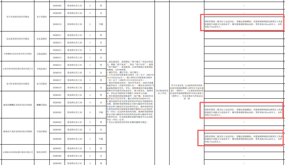 据媒体报道,云南省农村信用社2026年校园招聘岗位表显示,昆明官渡农村合作银行此次招聘22名营业网点员工,分为三个岗位类别:“营业网点员工01”岗位招聘9人,限制男性报考;“营业网点员工02”招聘9人,限制女性报考;“营业网点员工03”招聘4人,不限性别。前两类岗位要求全日制硕士研究生及以上学历、28周岁及以下等,而“营业网点员工03”在满足上述要求的基础上,还须持有国家二级及以上运动员证,须通过体能测试;在篮球或排球或足球项目上具备较强的专业能力与竞技水平,擅长篮球或排球运动,男性身高185cm及以上,女性身高175cm及以上。