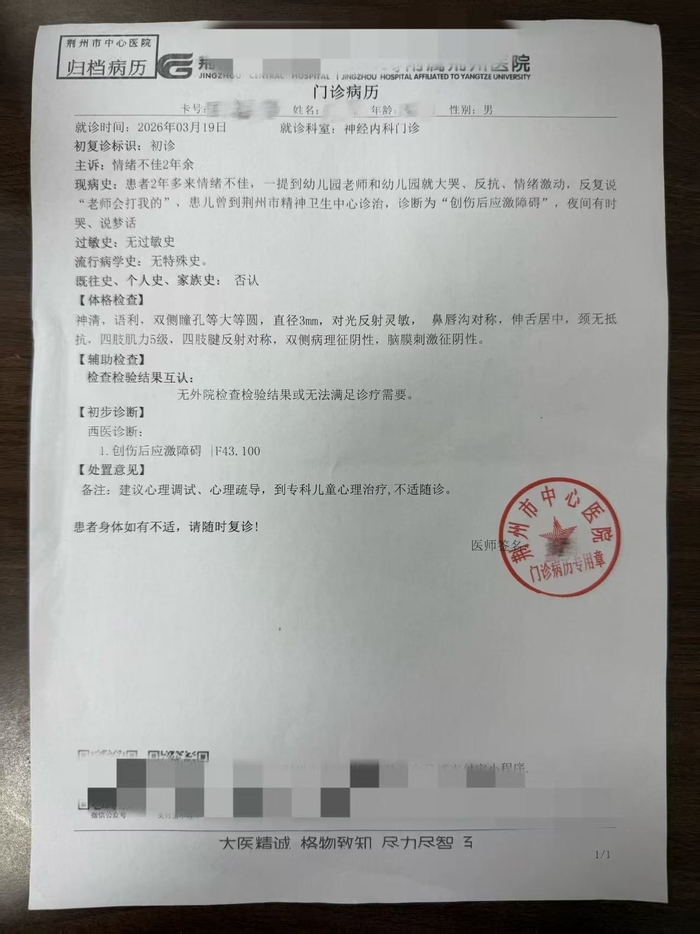刘女士告诉记者,自己的孩子2023年7月入园,7月起便遭到幼师们的粗暴对待,事发时仅2岁5个月,因年幼无法清晰表达,回家只含糊说“老师打我”。事后她调取监控才发现,孩子在园内长期遭遇类似对待。“直到现在,孩子一听到‘幼儿园’‘老师’就出现应激反应,医院确诊为创伤后应激障碍,如今孩子5岁多,仍不敢入园,常年在家。”刘女士说。