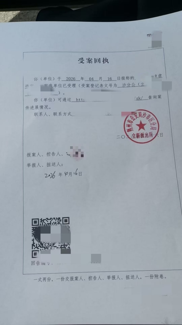 4月16日,新黄河记者就此事联系立新派出所,其工作人员表示:“案件已经受案,但具体内容不方便透露。”当天晚上,刘女士向新黄河记者出具了一份落款日期为4月16日、由立新派出所出具的受案回执,回执中明确表示已受理该案。