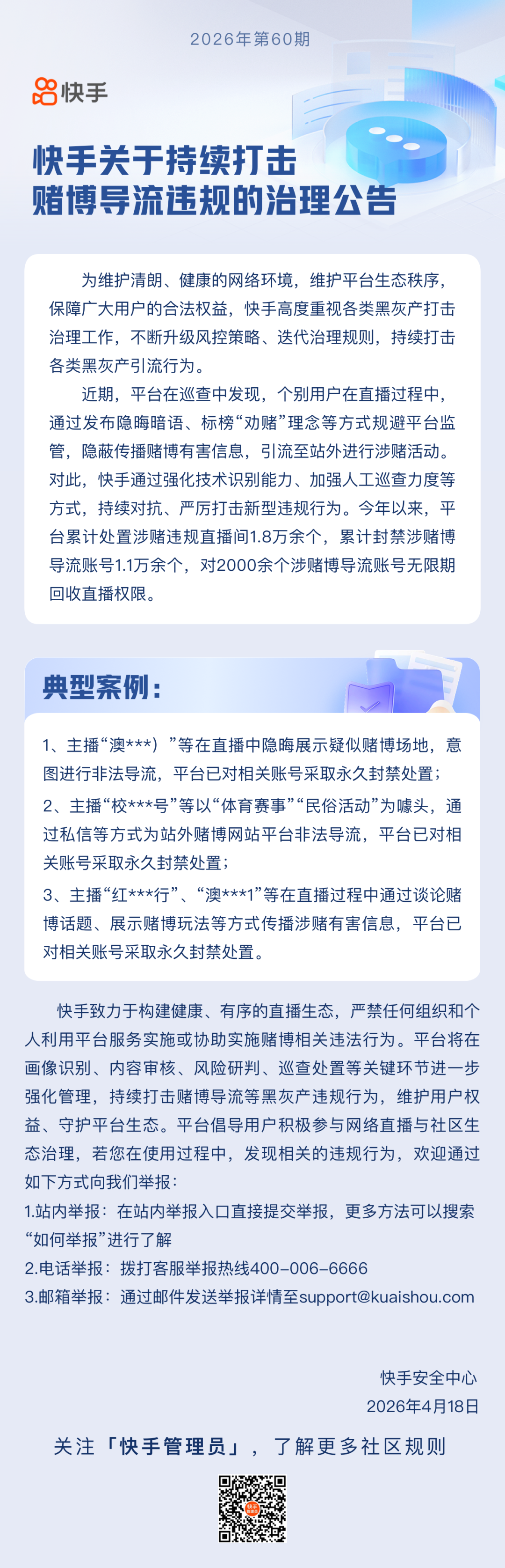 对此,快手通过强化技术识别能力、加强人工巡查力度等台累计处置涉赌违规直播间1.8万余个,累计封禁涉赌博导流账号1.1万余个,对2000余个涉赌博导流账号无限期回收直播权限。