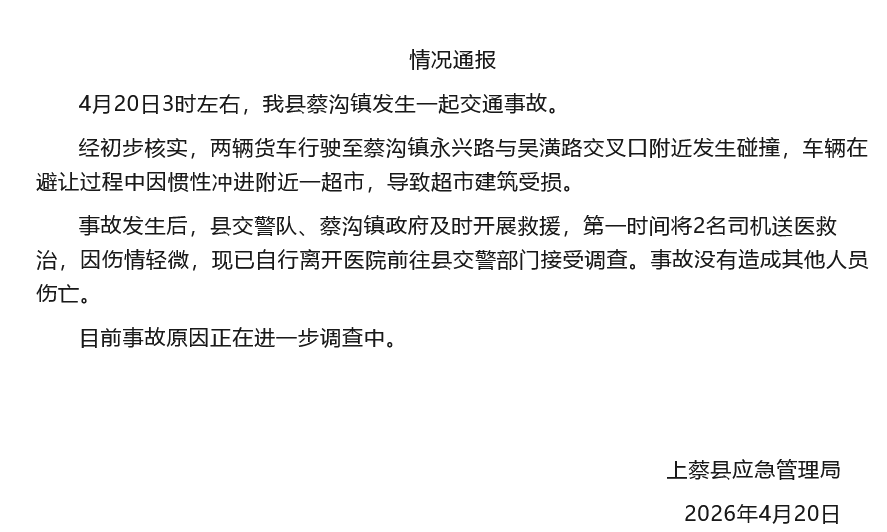 两辆货车凌晨相撞冲进一超市,河南驻马店通报:2名司机已送医救治,伤情轻微