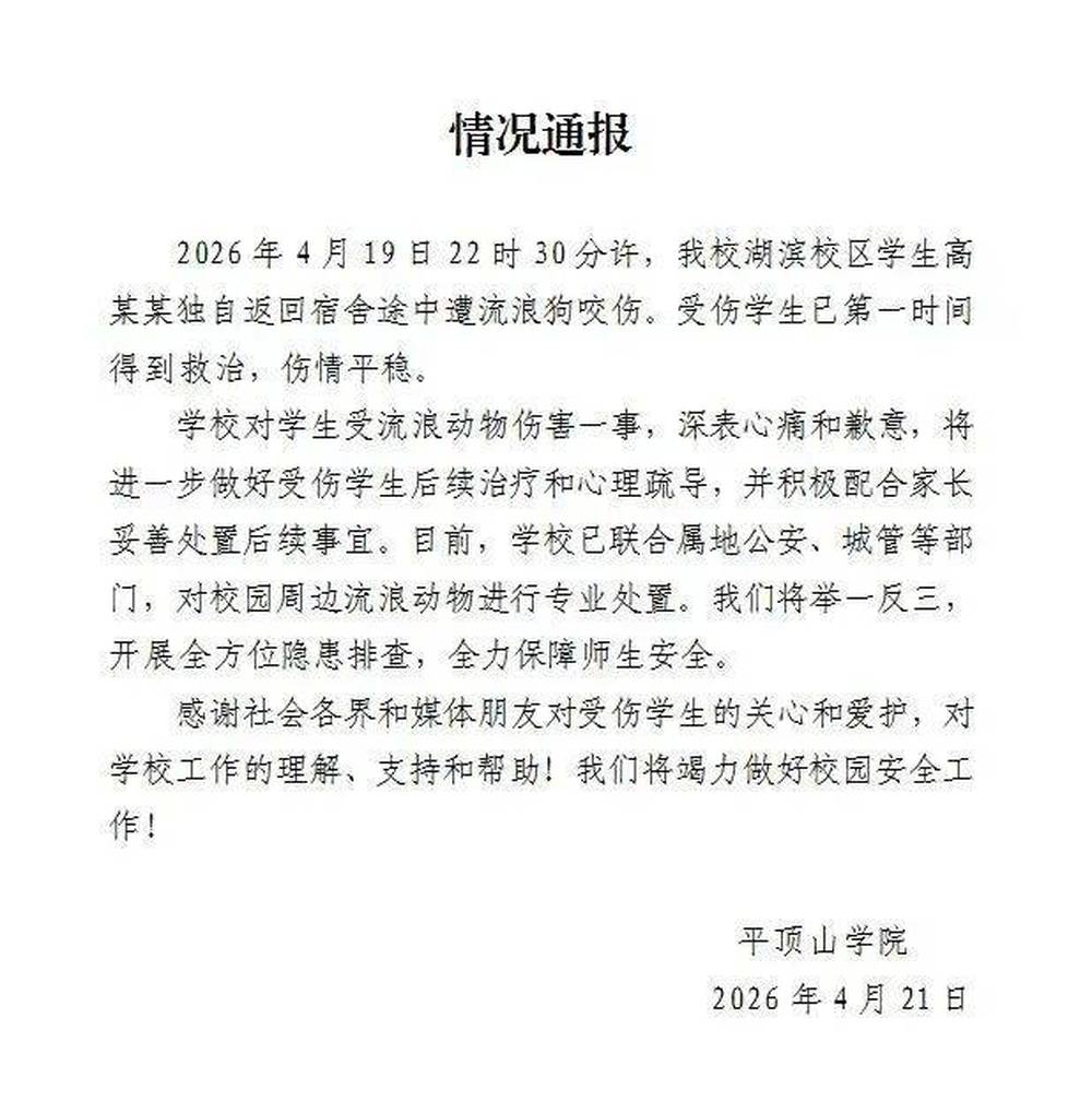 2026年4月19日22时30分许,我校湖滨校区学生高某某独自返回宿舍途中遭流浪狗咬伤。受伤学生已第一时间得到救治,伤情平稳。