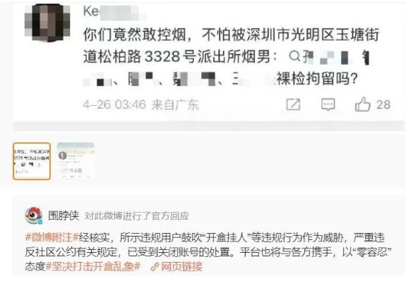 26日下午,微博社区观察员官方账号“围脖侠”回应:“经核实,所示违规用户鼓吹‘开盒挂人’等违规行为作为威胁,严重违反社区公约有关规定,已受到关闭账号的处置。平台也将与各方携手,以‘零容忍’态度坚决打击开盒乱象。”记者搜索该账号,发现已无法显示。