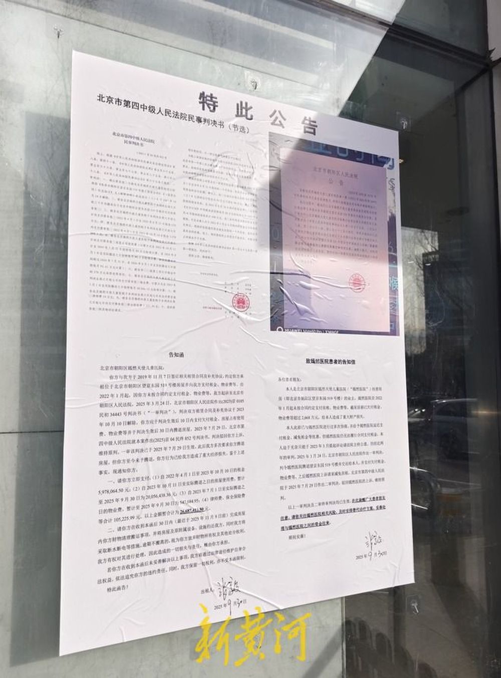 近日,北京嫣然天使儿童医院(以下简称“嫣然医院”)陷入欠租风波持续受到关注。1月19日,新黄河记者在嫣然医院看到,医院两侧的标识和字样都已被拆除,医院门口处贴有法院判决书、公告以及房东的告知函等。其中一张告知函显示,至2025年9月30日,租金、物业费以及律师费、保全保险费等合计超过2600万元。据悉,此前法院虽已下达判决,但医院暂未支付租金或腾退房屋。