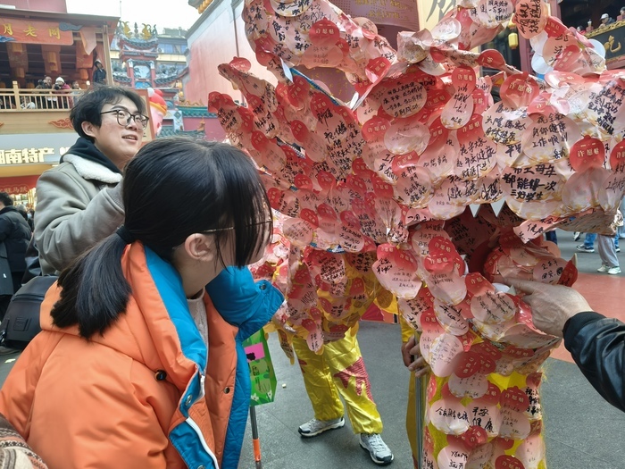 舞龙队的成员小张,今年25岁,从事这一行已多年。今年也是他所在的舞龙队第一年来火宫殿表演,为此,他从除夕到大年初五都没空回娄底老家,当被问及没陪家人过年是否太辛苦时,小张报以一笑,“辛苦嘛,工作是这样的。”