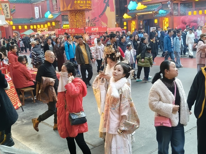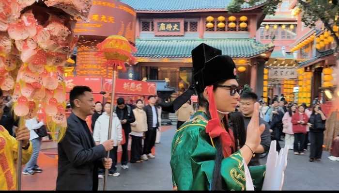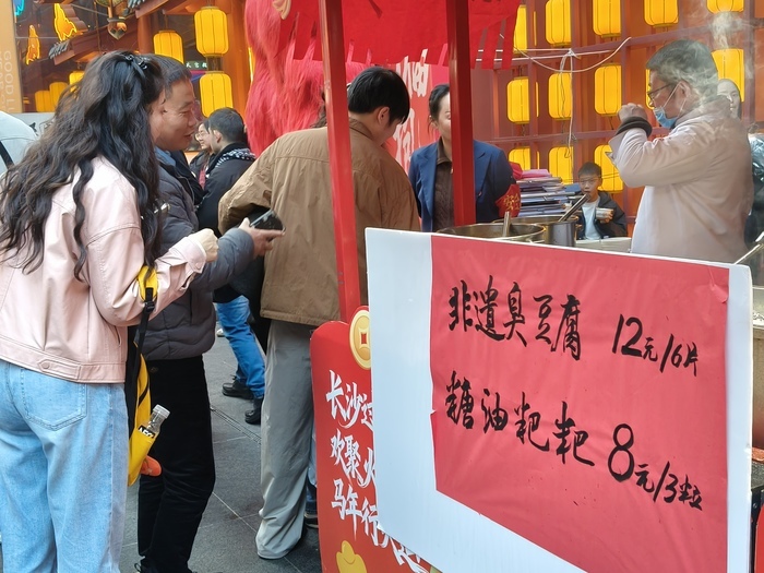 来自上海的游客陈先生,带着10岁的儿子来长沙旅游过年,大年初五当天,他和孩子一下高铁就来了坡子街打卡,和上海城隍庙的庙会相比,他也很喜欢火宫殿的庙会和小吃,“挺热闹的,长沙(小吃)还是有些自己的特色,臭豆腐味道蛮不错的。”