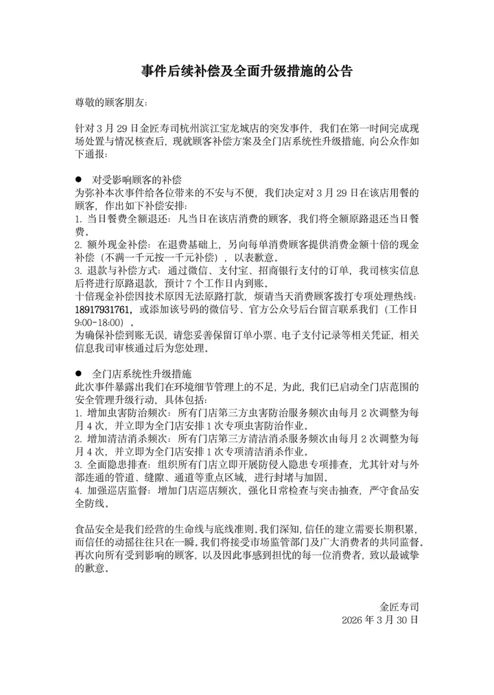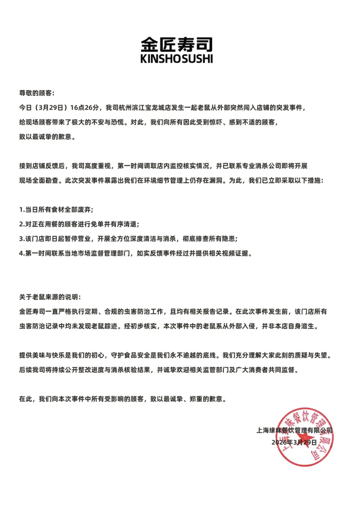 当晚,金匠寿司就杭州滨江宝龙城店发生老鼠闯入门店事件发布致歉声明称,当日16时26分,一只老鼠从外部突然窜入店内。事发后已第一时间调取监控核实情况,并联系专业消杀公司开展现场全面勘查。涉事门店当日所有食材已全部废弃,对在用餐顾客进行免单并有序清退,同时自即日起暂停营业,进行全方位深度清洁与消杀。金匠寿司进一步称,涉事门店此前一直按规定开展虫害防治,未发现鼠踪。根据第三方出具的鼠类分析及防治报告,此次捕获鼠类为黄胸鼠,结合现场勘查情况判断,老鼠大概率由门店与商场走廊相通的入口侵入,并非门店内部滋生。
