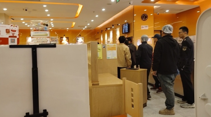 往店里看,有十余人正在里面忙碌,其中有多位穿制服的执法人员。执法人员在店员的协助配合下正在检查各项卫生措施。