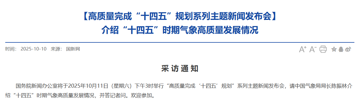 国务院新闻办公室将于2025年10月11日(星期六)下午3时举行“高质量完成‘十四五’规划”系列主题新闻发布会,请中国气象局局长陈振林介绍“十四五”时期气象高质量发展情况,并答记者问。