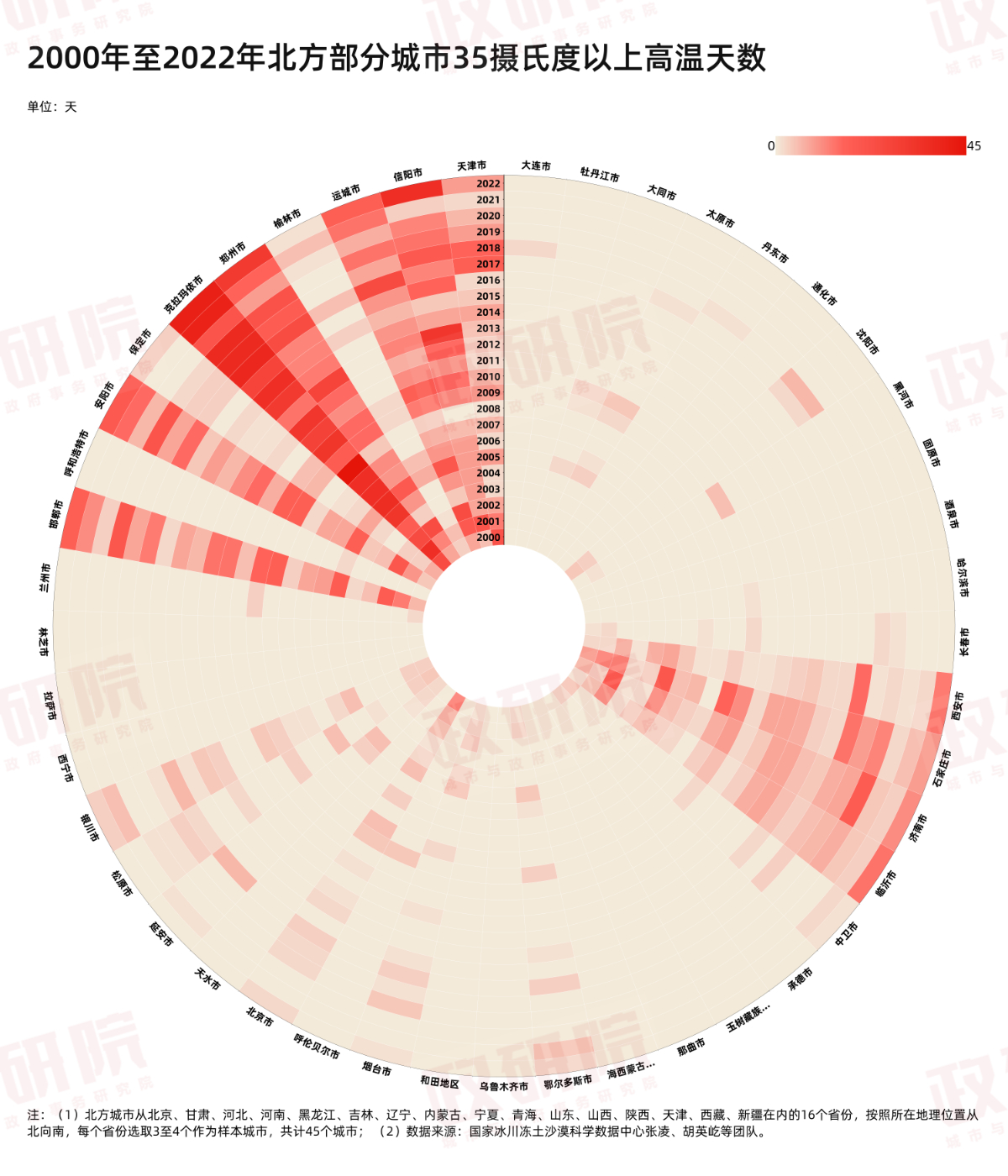 根据中国气象局的定义,日最高气温达到35℃及以上即被认定为高温天气。在我们所统计的45个北方城市中,与2000年夏季相比,高温天气呈现出普遍增强的态势。
