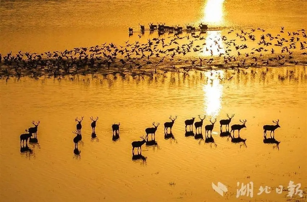 11月27日清晨,石首天鹅洲长江故道,麋鹿和雁群和谐共处。