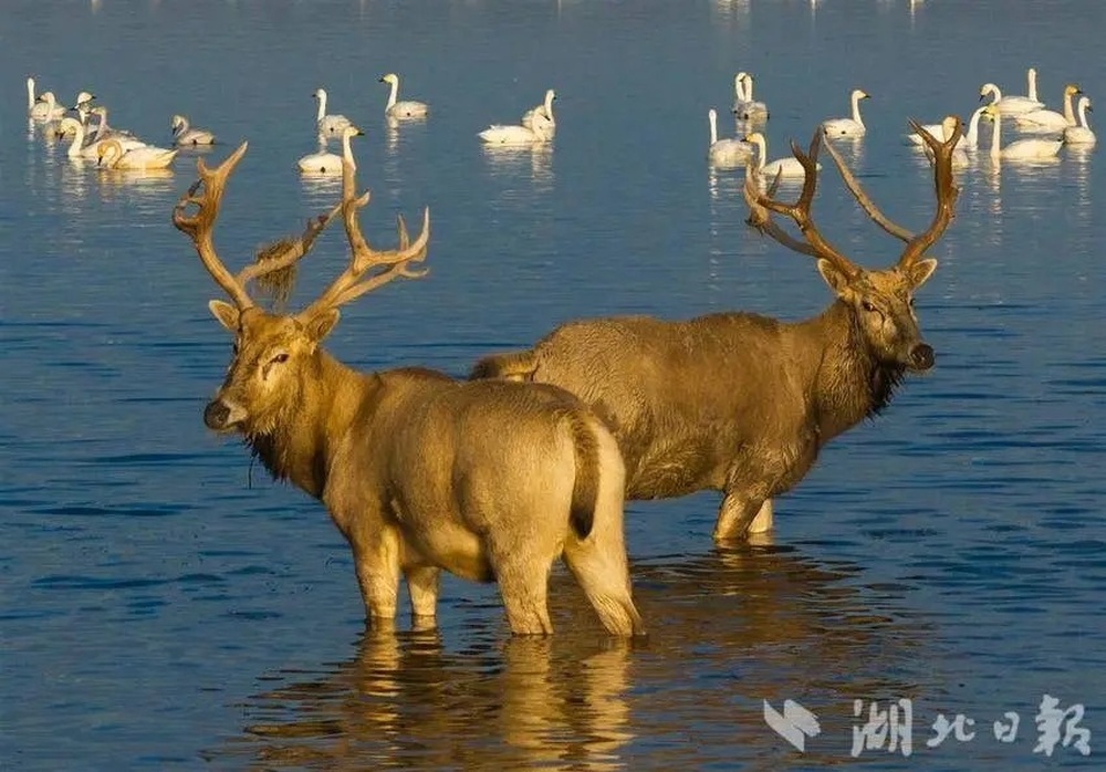 11月26日,两只公麋鹿在天鹅洲故道里休憩,它们背后的水面停满了前来越冬的小天鹅。