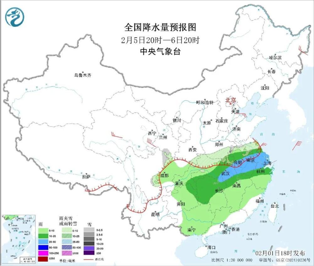5-6日,冷空气南下和暖湿气流交汇,又将有一次降水过程,江淮、江汉、江南、西南地区东部及华南大部等地有小到中雨,其中江汉北部、江淮、江南东北部还将出现雨转雨夹雪或雪;华北北部、东北地区东部的部分地区有分散性零星小雪或小雪。