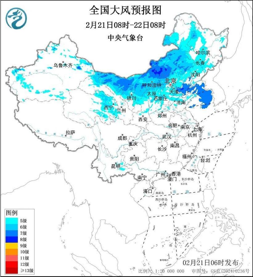 中央气象台2月21日6时继续发布大风黄色预警。预计,21日8时至22日8时,新疆北疆东部、内蒙古大部、甘肃河西、宁夏中北部、青海东部、陕西北部、华北大部、东北地区中西部、辽东半岛、山东半岛等地的部分地区有5至7级风,阵风8至10级,局地风力可达11级以上。渤海、渤海海峡、黄海北部和中部海域将有7至8级、阵风9级的大风。