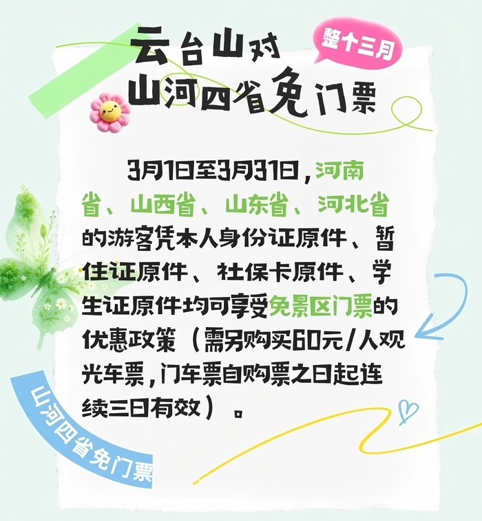 2月25日,河南焦作云台山景区宣布3月1日—3月31日,对河南、山西、山东、河北4个省份免门票,“山河四省”游客凭本人身份证原件、暂住证原件、社保卡原件、学生证原件等均可享受免景区门票优惠政策。