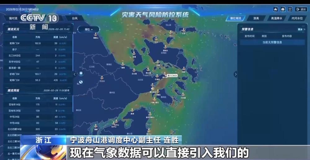 宁波舟山港调度中心副主任 连胜:以往我们的港口生产调度,主要是靠经验“看天吃饭”,遇到大雾、大风影响的时候,往往就是“一刀切”停工停产,对码头造成重大损失。现在气象数据可以直接引入我们的生产调度系统,当能见度或者风速达到临界值的时候,系统可以自动推送我们预警信息。据我们初步统计,去年大雾的管制时长同比下降10%,大风管制时长同比下降20%,增加了近200小时作业窗口,保障5000艘次船舶安全进出港。