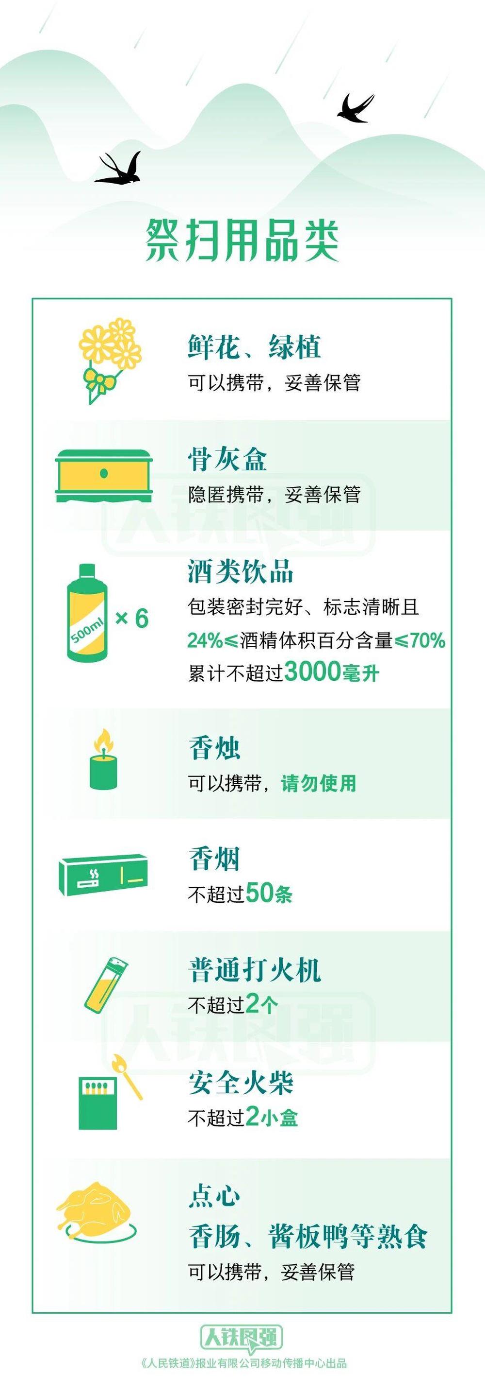 +订阅清明将至,出行高峰即将到来。不少旅客在收拾行李时都会犯难:祭扫用品到底能不能带上火车?哪些物品属于禁止携带的违禁品?为了让您的清明出行更顺畅,这份携带指南请收好,出发前对照检查,避免在安检口“卡壳”。