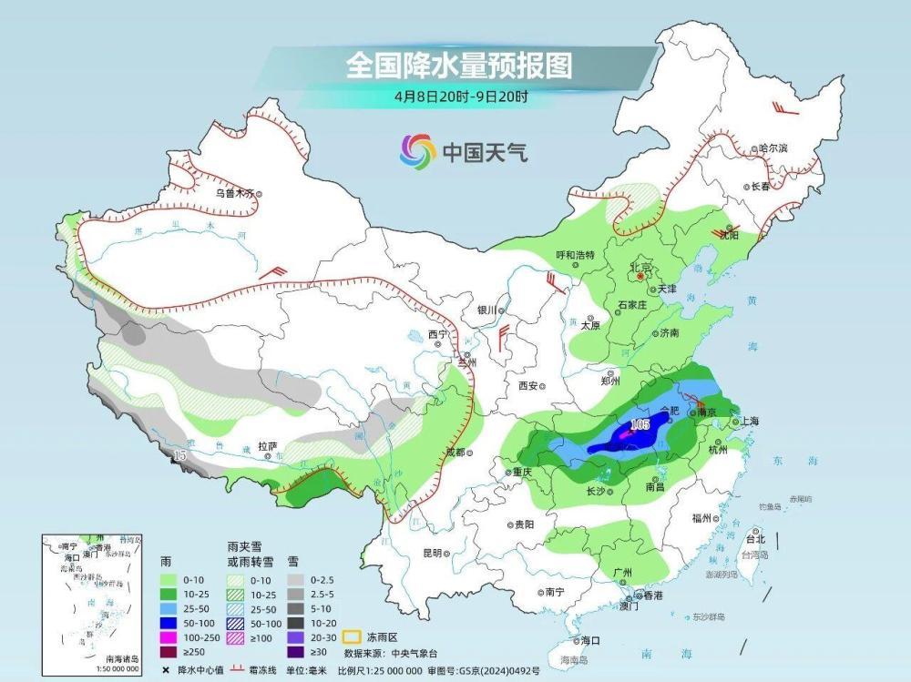 4月7日夜间开始,随着副热带高压加强北上,主雨带将北抬至江南北部至长江中下游地区。4月8日至9日,江淮、江汉南部、江南北部及重庆等地部分地区有中到大雨,局地暴雨或大暴雨,强对流天气也来“助阵”。