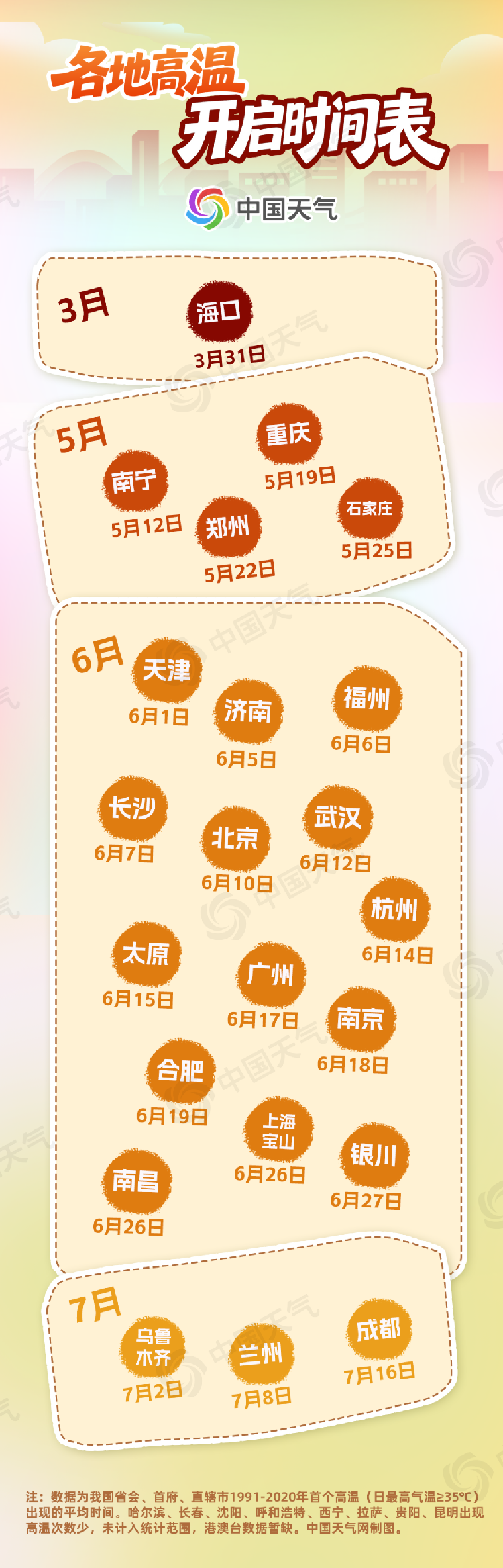中国天气网盘点了1991至2020年的气象大数据发现,在省会、首府、直辖市中,海口是最早出现高温的城市,通常高温在3月底就会早早到来,今年的高温季来得并不算早。南宁的首个高温日为5月12日,而同样属于华南的广州和福州则要等到6月份。