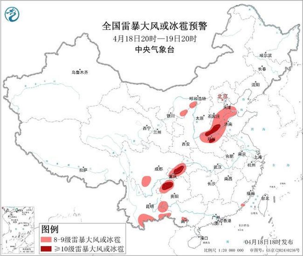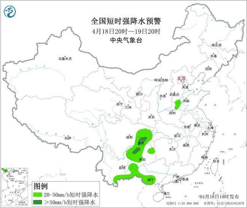 预计4月18日20时至19日20时,内蒙古河套地区、华北南部、黄淮中西部、西南地区东部和南部等地的部分地区将有8级以上雷暴大风或冰雹天气,其中,河北南部、河南中北部、山东西部、四川东南部、重庆中西部、贵州西北部等地的部分地区将有10级以上雷暴大风,最大风力可达11级以上;黄淮中西部、西南地区东部和南部、华南西部等地的部分地区将有小时雨量大于20毫米的短时强降水天气,其中,重庆中西部、贵州西北部等地的部分地区小时雨量大于50毫米,最大可达60毫米以上。