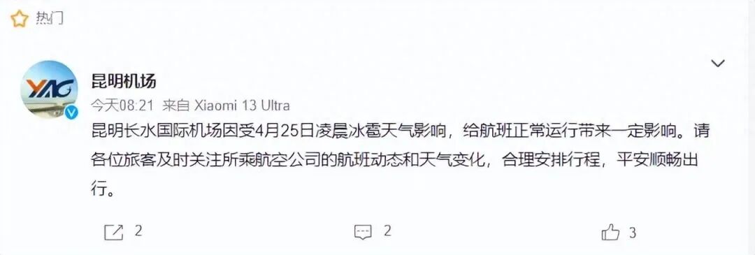 4月25日上午,昆明机场微博发布消息:昆明长水国际机场因受4月25日凌晨冰雹天气影响,给航班正常运行带来一定影响。请各位旅客及时关注所乘航空公司的航班动态和天气变化,合理安排行程,平安顺畅出行。