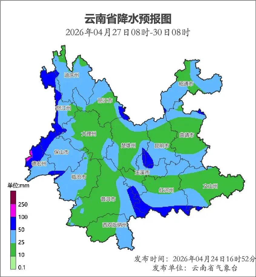 另据云南省气象台消息,受低涡切变和冷空气共同影响,预计4月27日至29日,云南大部将出现降温降雨天气过程。中北部最高气温将下降4~6℃,局地超过8℃;全省大部将自东向西出现中雨局部大雨、暴雨,其中昭通市、曲靖市北部和南部、昆明市南部、楚雄州北部、玉溪市北部和西南部、文山州西南部、红河州南部、普洱市东部、西双版纳州东部、临沧市中西部、保山市、德宏州、怒江州、迪庆州、丽江市北部和东南部过程累计雨量30~60毫米,德宏州西部局地80~120毫米。伴随降雨还将出现雷电和局地短时强降水、大风、冰雹等强对流天气。