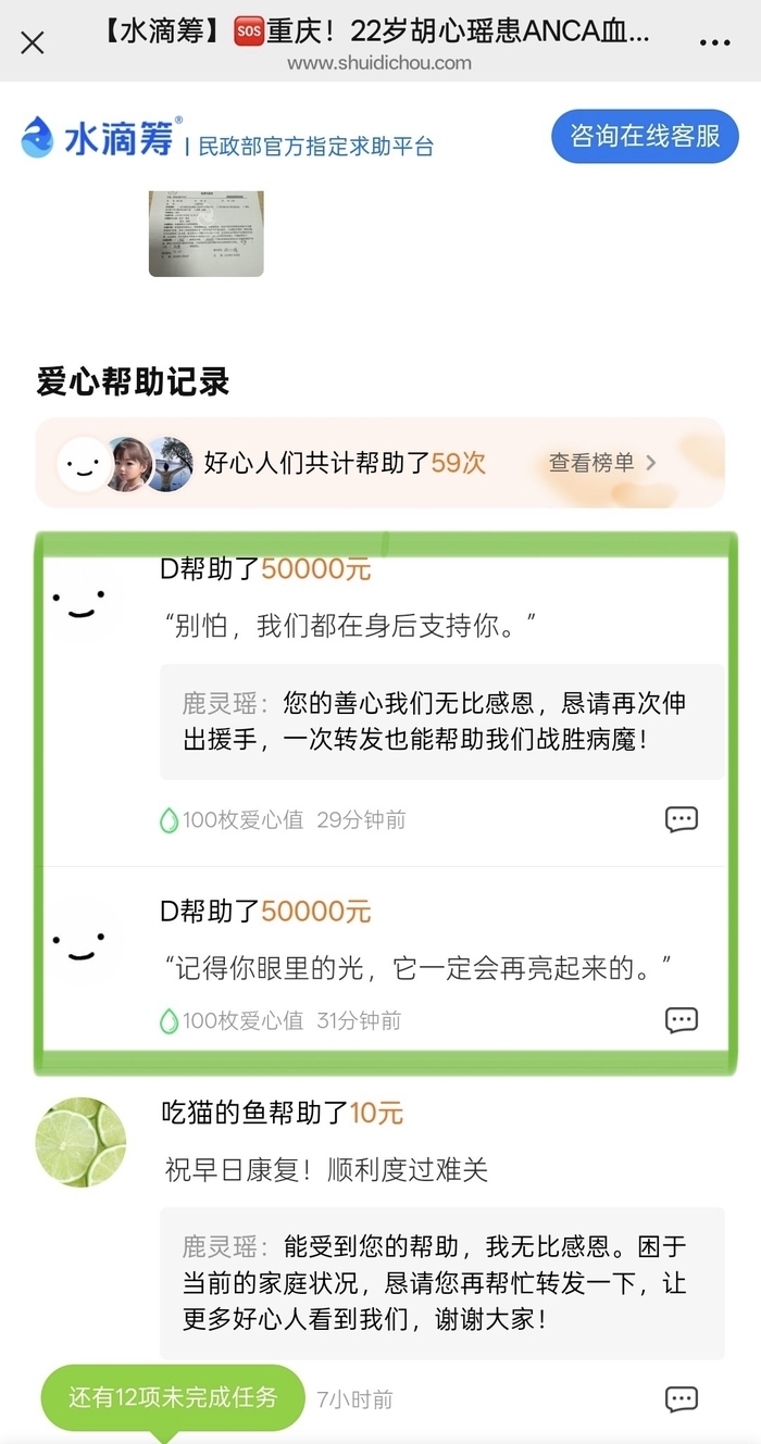 “我看到她发起的水滴筹时,猜到她的病情可能再次恶化,她真的走投无路了。”仓也知道,直接转账依然会被她退回,于是选择通过水滴筹,为胡心瑶捐款10万元。