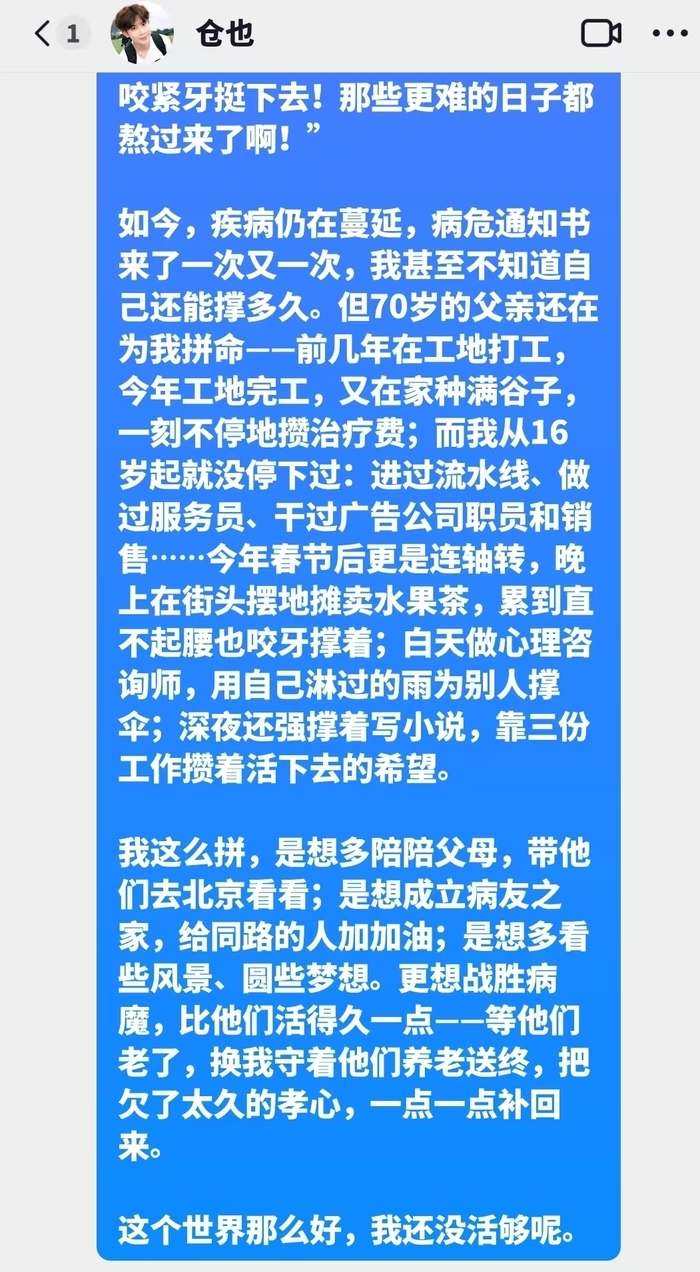 胡心瑶的人生,自14岁那年便被病痛蒙上了阴霾。从去年6月开始,新黄河陆续报道了胡心瑶八年来与病魔对抗背后的感人故事(此前报道:10天收到5份病危通知书,一位00后女孩的自救)。前男友离世留给她的善款与遗言、筹建病友小家的艰难、宴请全村人看坝坝电影、卖果汁、写小说自救……这些事迹也让这位坚强的重庆女孩走进大众视野,她的故事感染并鼓励着无数人,其中就包括自媒体博主仓也。