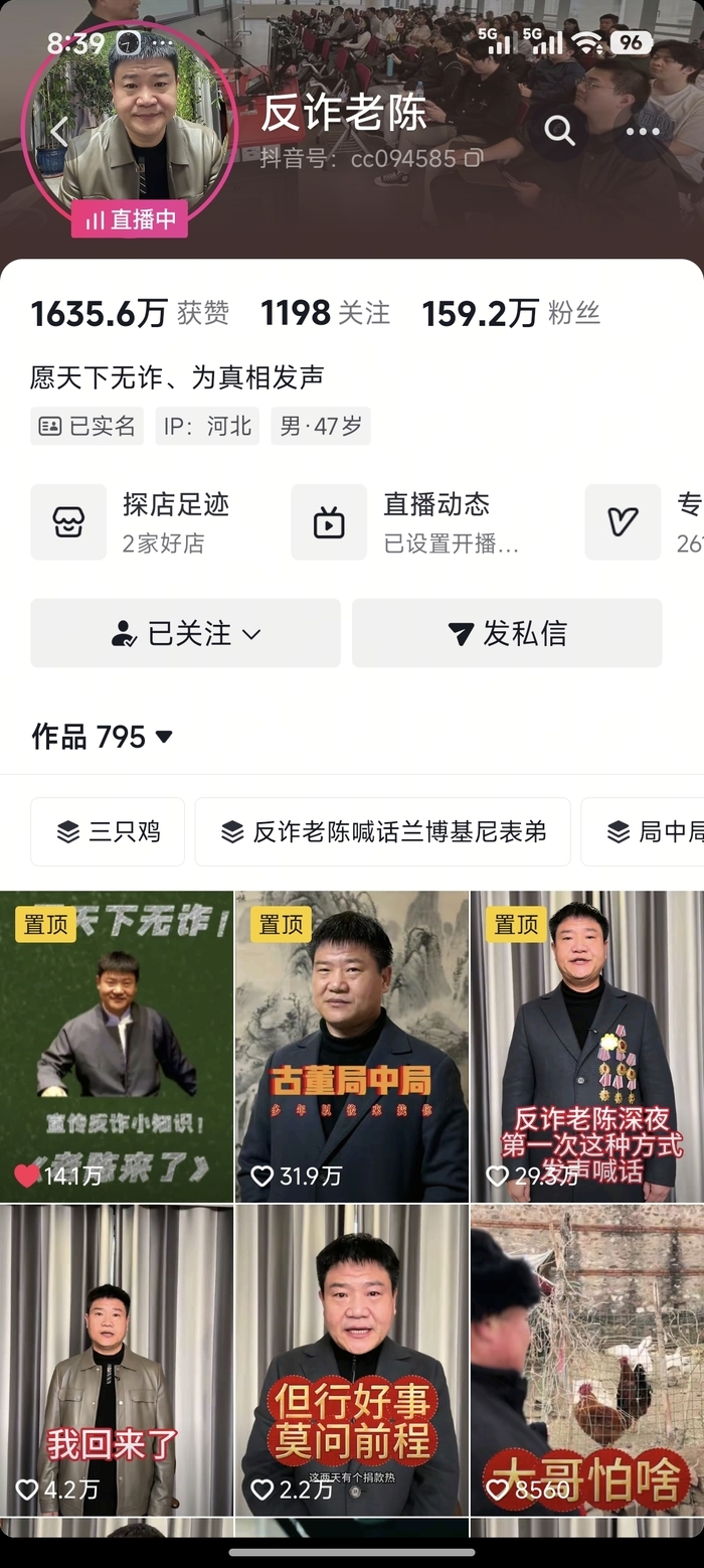 3月29日,记者留意到,反诈老陈在社交媒体发布视频,直言“我回来了”。其账号已解除关注限制,可正常搜索、关注,粉丝量恢复至159.2万,作品恢复至795条。