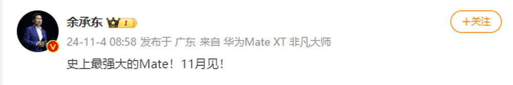 11月4日,华为常务董事、终端BG董事长、智能汽车解决方案BU董事长余承东发文:“史上最强大的Mate!11月见!”网友热议:“ 上一次‘史上最强大’是Mate 40”“mate40已经等候多时了”“只有mate才能超越mate”……