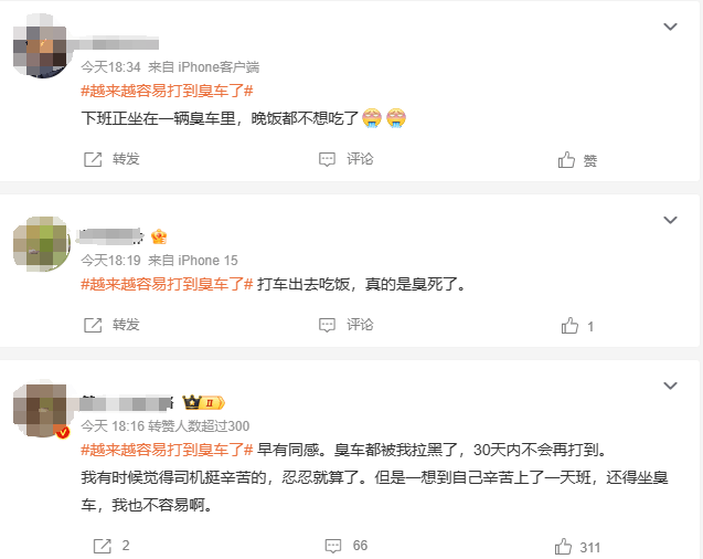话题一出,立刻引起众多网友热议,许多网友都表示有类似的打车经历。网友们吐槽“打网约车就像钻进司机的被窝”“十个车有九个是臭的”。除了“臭味车”之外,还有对“烟味车”的排斥以及对女性司机车功能的呼唤。