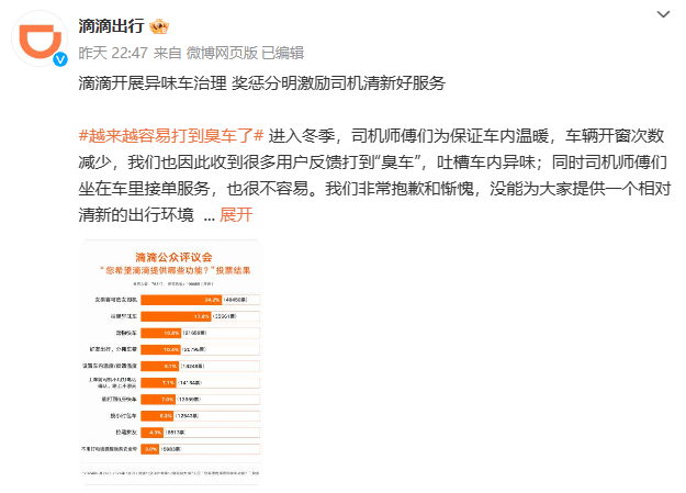 12月23日晚“越来越容易打到臭车了”话题词冲上热搜。对此,滴滴出行道歉。滴滴表示,目前,滴滴正开展“异味车”治理专项,通过上线拉黑异味车功能、对车内空气差评率较高的司机暂停服务培训学习、对司机服务开展正向激励考核等方法,争取改善用车体验。
