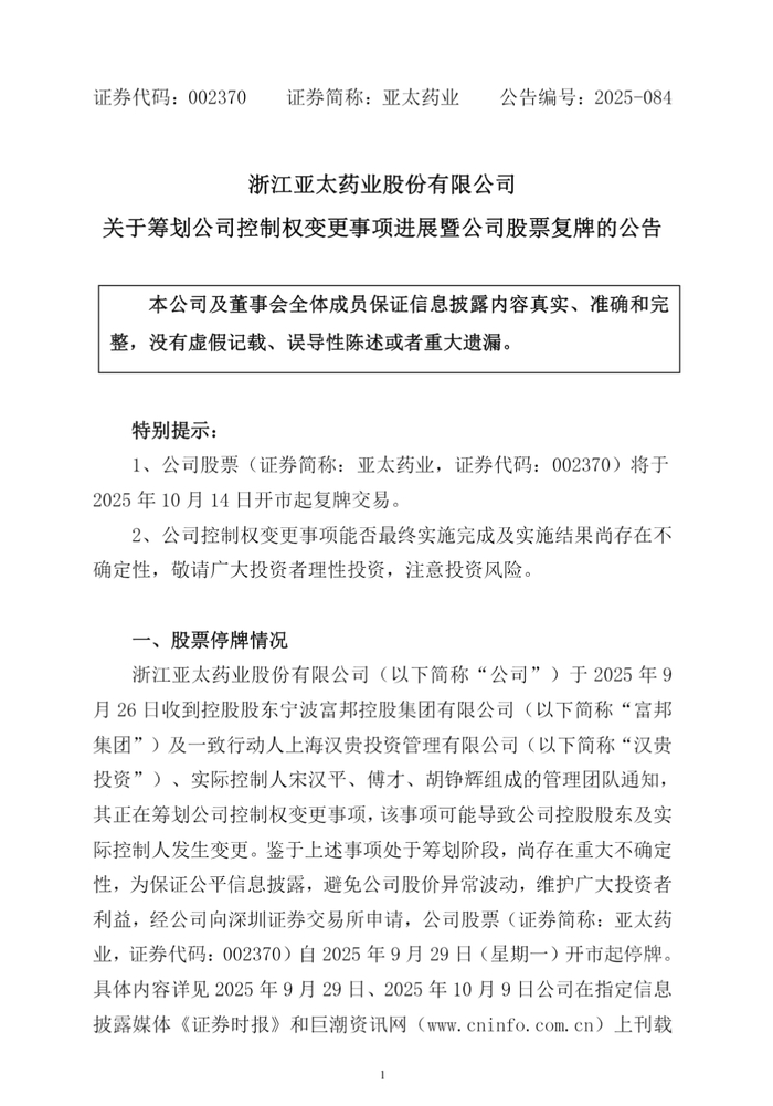 10月14日早间,亚太药业(002370.SZ)通过巨潮资讯网发布控制权变更公告,公司控股股东富邦集团及其一致行动人汉贵投资拟以9亿元总价转让全部股份,接盘方为浙江星浩控股合伙企业(有限合伙)(下称“星浩控股”)及其一致行动人浙江星宸股权投资合伙企业(有限合伙)(下称“星宸投资”)。此次交易完成后,公司实际控制人将由宋汉平、傅才、胡铮辉管理团队变更为星浩控股最终受益人邱中勋。