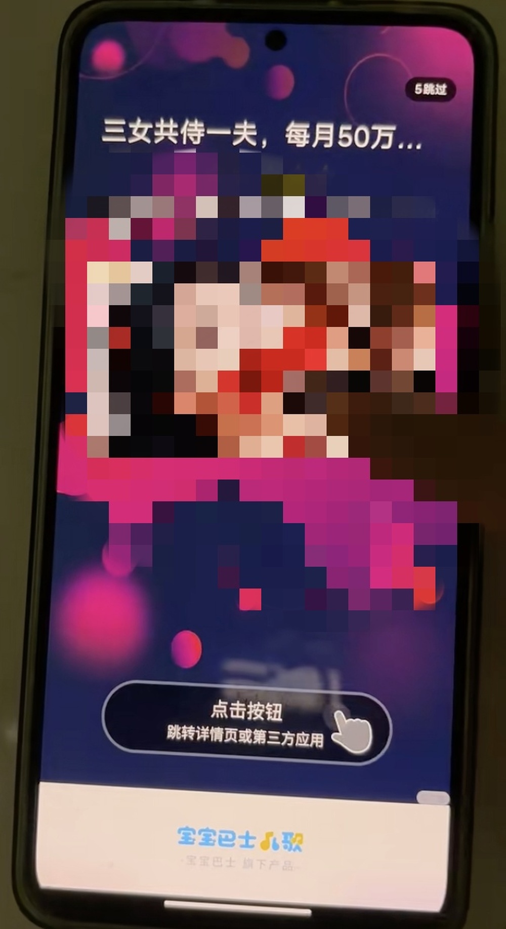 打开宝宝巴士,弹出的页面显示:“三女共侍一夫,每月50万生活费”,根据一位用户出示的录屏画面,一名穿着暴露的女士躺在床上,嘴里塞着红布。