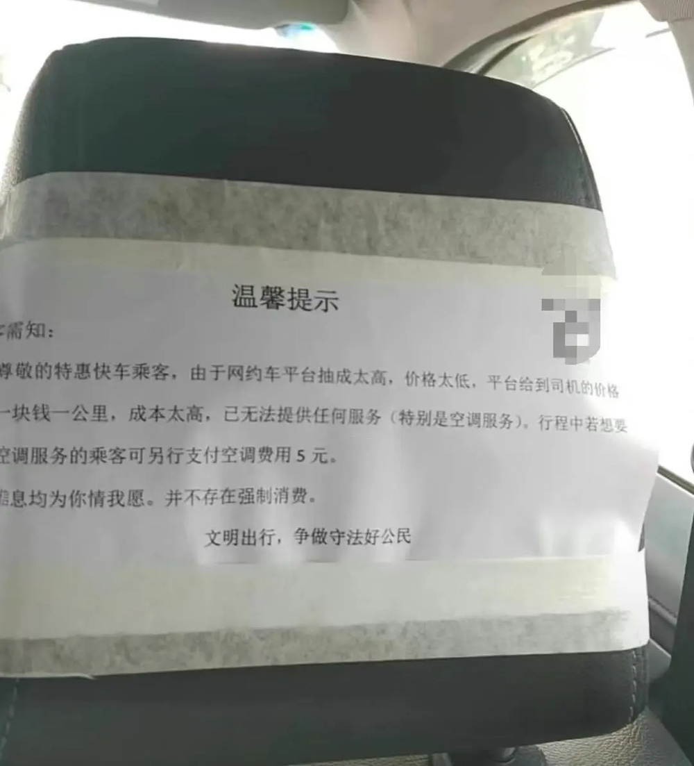 “一口价”订单被索要空调费,这不是王女士一人的遭遇。红星新闻记者在多个社交平台上看到,不少网友都在吐槽自己上车后被要5-10元空调费的情况。甚至在一些图片里,部分司机会直接张贴告示,要求“一口价”乘客另付空调费、手机充电费等。