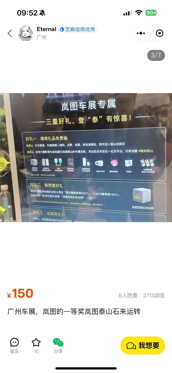 这一赠品源自11月广州车展期间岚图举办的现场互动。社交媒体上,不少参展观众晒出了中奖记录。
