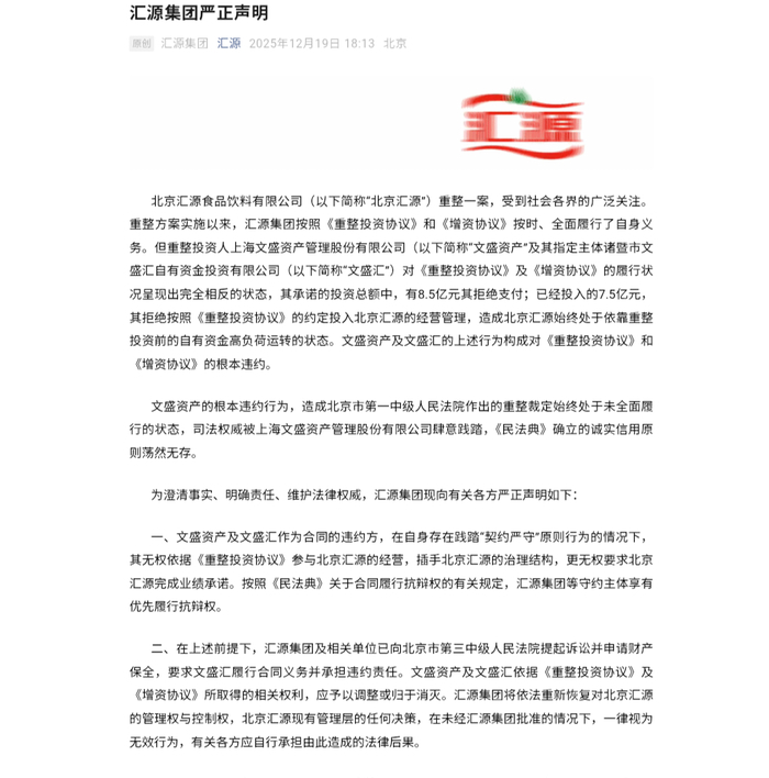 声明中,汇源集团就北京汇源食品饮料有限公司(下称“北京汇源”)重整相关事宜,毫不留情地直指重整投资人上海文盛资产管理股份有限公司(“文盛资产”)及其指定主体诸暨市文盛汇自有资金投资有限公司(“文盛汇”)存在严重的根本违约行为。