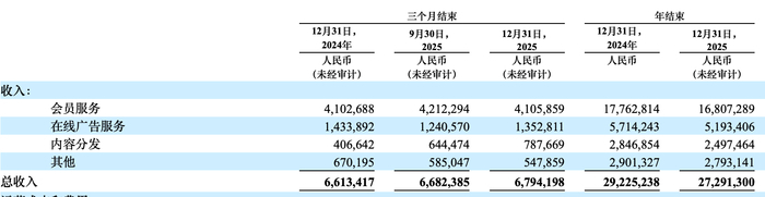 核心业务板块中,会员服务收入作为第一大收入来源,2025年实现168.07亿元,同比下降5%,主要受内容供给轻量化影响。在线广告服务收入51.93亿元,同比下降9%,财报解释称系宏观压力下广告主调整投放策略所致。