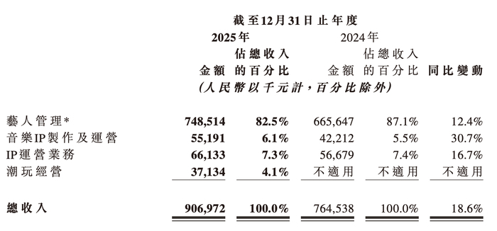 乐华娱乐的业务架构中,艺人管理长期占据绝对核心地位。2025年业绩报显示,公司艺人管理业务收入达7.485亿元,占总营收的82.5%,同比增长12.4%;该业务毛利1.704亿元,占总毛利的76.4%,毛利率从2024年的17.4%提升至22.8%,成为公司盈利增长的主要引擎。