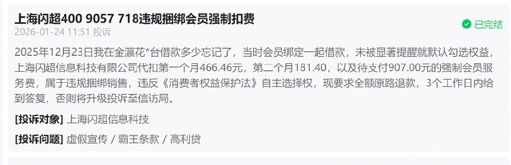 更值得警惕的是,部分平台的扣费并非单次行为,而是在借款后前几个月持续扣费。一名消费者今年1月份的投诉显示,2025年12月23日其在金瀛花平台借款时,被强制绑定会员权益,后续被闪超科技代扣首月费用466.46元、次月181.4元,目前仍有907元会员服务费处于待支付状态。