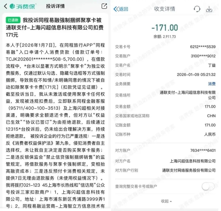 消费保平台上,另一名消费者也遭遇了类似困境。该消费者表示,2026年1月7日,其在同程易融申请消费贷款时,平台未以显著方式明示“聚享卡”为独立收费服务,仅通过默认勾选、隐藏勾选框等方式强制捆绑,导致其在不知情、未明确同意的情况下,被自动扣除171元“聚享卡”费用。