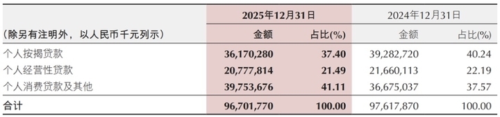 2025年末,零售贷款中的个人消费贷款及其他余额为397.54亿元,占零售贷款比重为41.11%,同比下降了8.39%。