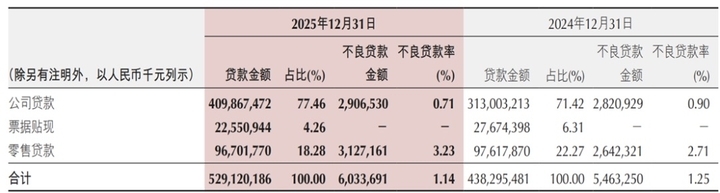 资产质量方面,截至2025年末,重庆银行贷款业务整体不良率为1.14%,同比下降0.11个百分点。拨备覆盖率245.58%,同比增加0.5个百分点。2025年末,重庆银行公司贷款不良贷款率0.71%,较上年末下降0.19个百分点;零售贷款不良贷款率3.23% ,较上年末上升0.52个百分点。