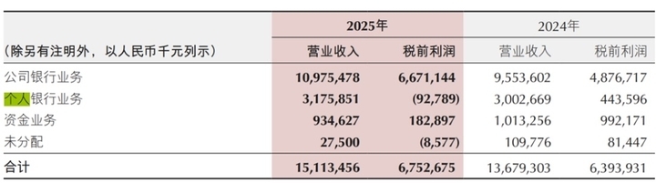 按照分部收入来看,去年重庆银行个人银行业务部实现营业收入31.76亿元,同比小幅下降5.73%;税前利润为-9279万元,税前利润较2024年的4.44亿元同比降幅达120.95%,为该行自A股上市以来首次个人银行业务税前亏损。